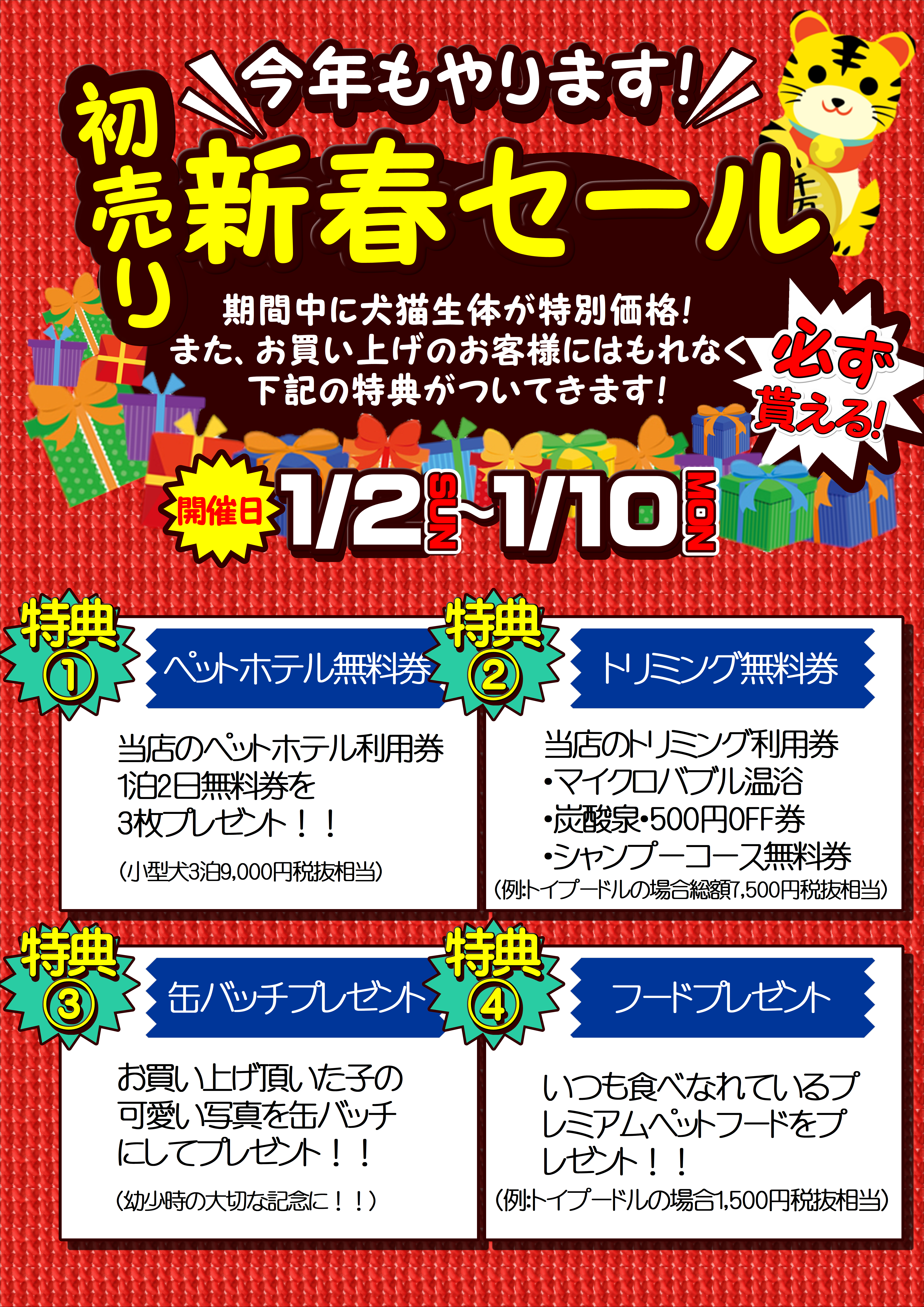 また、セール期間特典といたしましてご購入者様にもれなくフードプレゼントやペットホテル宿泊無料券など豪華特典も盛りだくさんとなっております!!